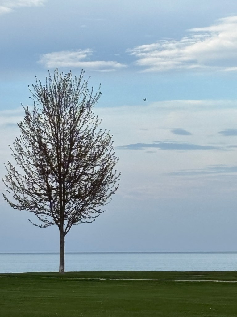 Approaching the park she stopped suddenly. I learned early in our life together that walks with Kerri are exercises in seeing. She sees a world that is mostly invisible to me because I am most often lost in my thoughts. She allows her eyes to roam without presupposition. Now, when she stops, before she shows me her photograph, I play the game of trying to see what grabbed her attention, what captured her eye. Inevitably, I am surprised by what she shows me. Her open focus is receptive. She doesn’t predict. She doesn’t seek. She responds. She sees composition beyond what she thinks-is-there. A tree. The lake. A strip of green.