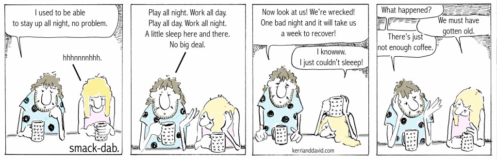 Filed under: smack-dab | Tagged: cartoon, coffee, comic, david robinson, davidrobinsoncreative.com, growing older, Kerri Sherwood, kerri sherwood itunes, kerrianddavid.com, kerrisherwood.com, middle age, nectar of the gods, relationship, saturday morning smack-dab, second chances, sleepless nights, smack-dab, survival beverage |