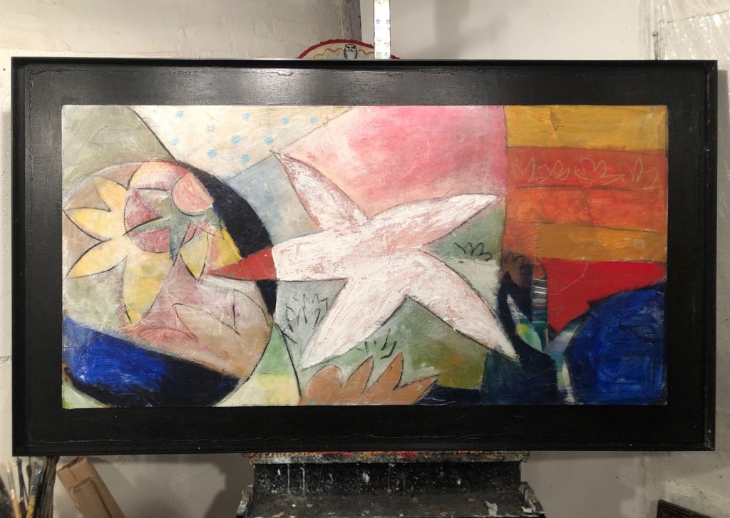 The new painting, had it made it into the world, would’ve been called, “Trains Through Trees.” I’ve been making sketches for a few years but, until recently, never arrived at something I liked. It’s a narrative. Our favorite yellow trail circles near railroad tracks and often on our walks a train rumbles through. For weeks Kerri made a series of videos, trying to catch the movement of the colorful graffitied train cars through the trees. Train performance art. I loved her excitement at the approaching train as she raced to a good spot to take her video. Those moments inspired an idea for a painting. The dreaded hotel art was the ideal canvas shape.