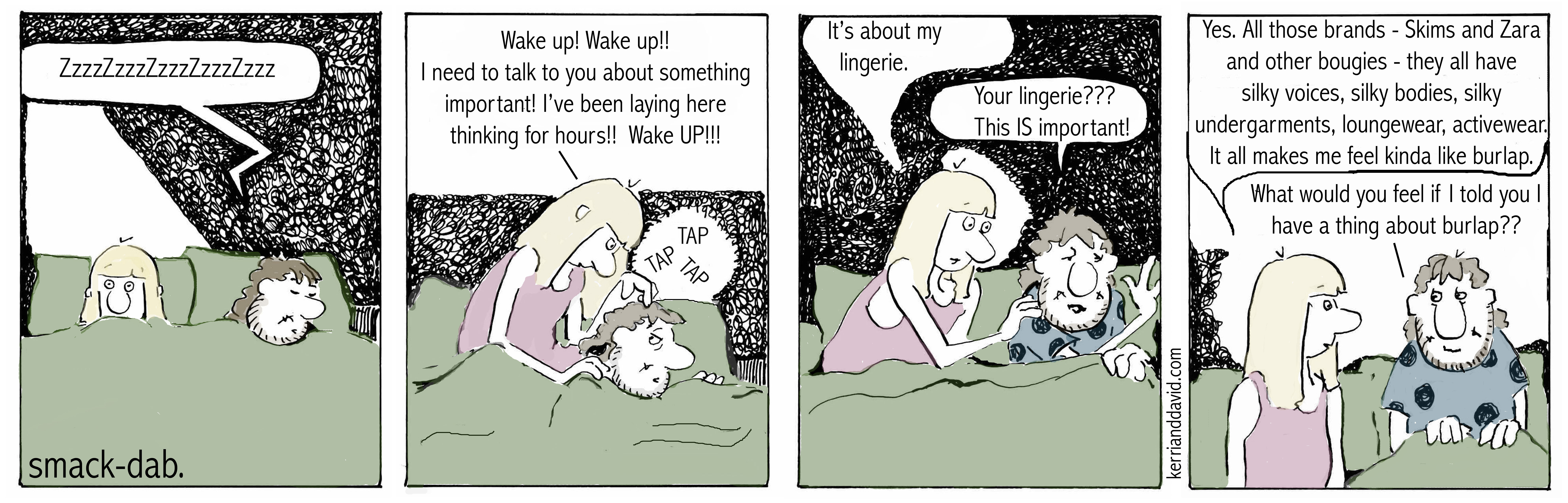 Filed under: smack-dab | Tagged: artistry, body, body image, body talk, cartoon, cartoonists, composer, david robinson, davidrobinsoncreative.com, Kerri Sherwood, kerri sherwood itunes, kerrianddavid.com, kerrisherwood.com, lingerie, marketing, marketing messages, media, media messages, middle age, middle age cartoon, middle age romance, painter, psyche, self esteem, self love, social messages, story, studio melange, the melange, two artists |