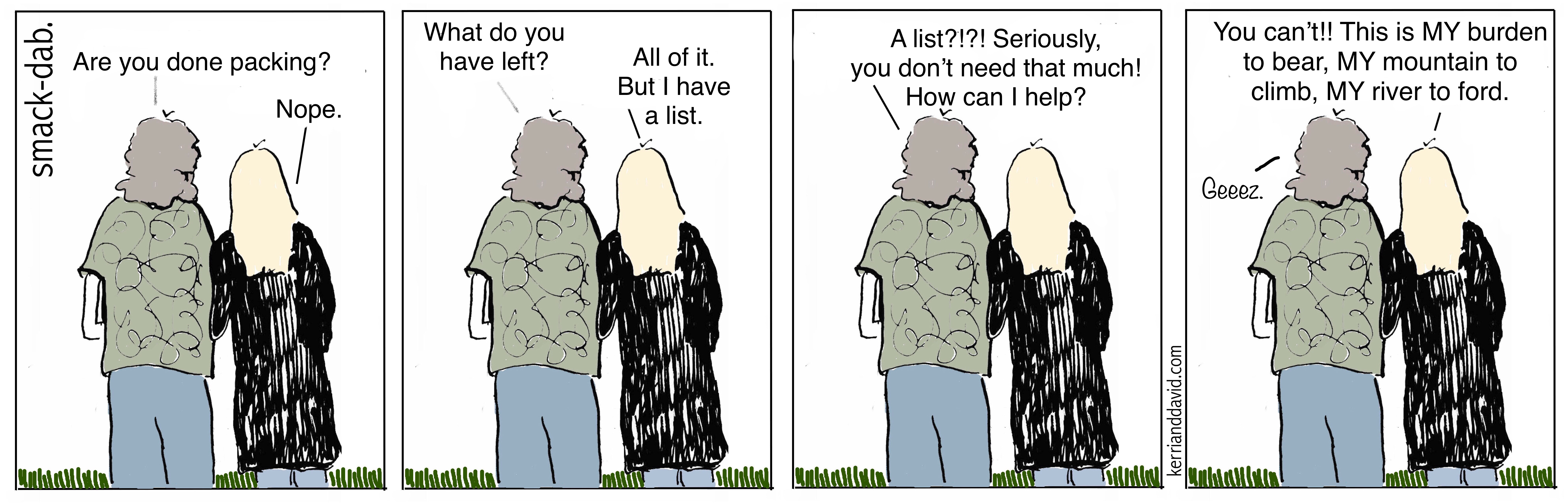 Filed under: smack-dab | Tagged: aarp, angst, artistry, david robinson, davidrobinsoncreative.com, doubt, helpful, Kerri Sherwood, kerri sherwood itunes, kerrianddavid.com, kerrisherwood.com, mars and venus, middle age cartoon, middle age romance, packing, relationship, simplicity, smack-dab, story, stress, studio melange, suffering, the melange, two artists, unhelpful, vacation |