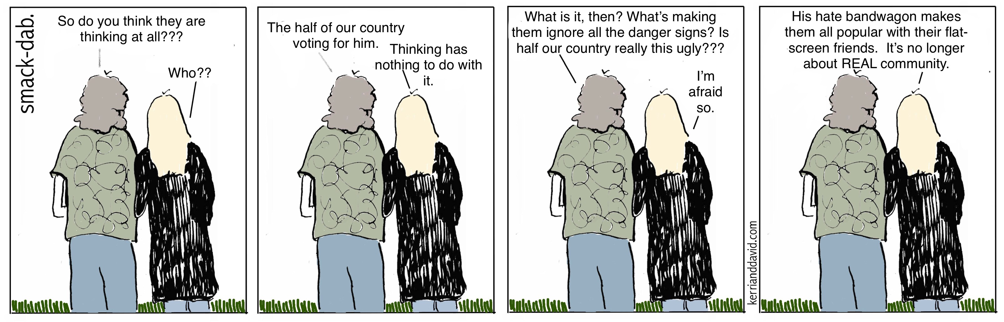 Kerri has a theory. She calls it “the flat friends”, the relationships available online that win likes and strokes for agreement. These relationships are abstractions; they are not real. They are easy, uncomplicated, and come with instant gratification. No dialogue required. No real communication. No imperative to support assertions with facts or data or…reality. Hate bubbles filled with easy lies and even easier agreement amongst flat friends. An ugly meme is all the verification needed in flat-friend-land. No real thinking required.