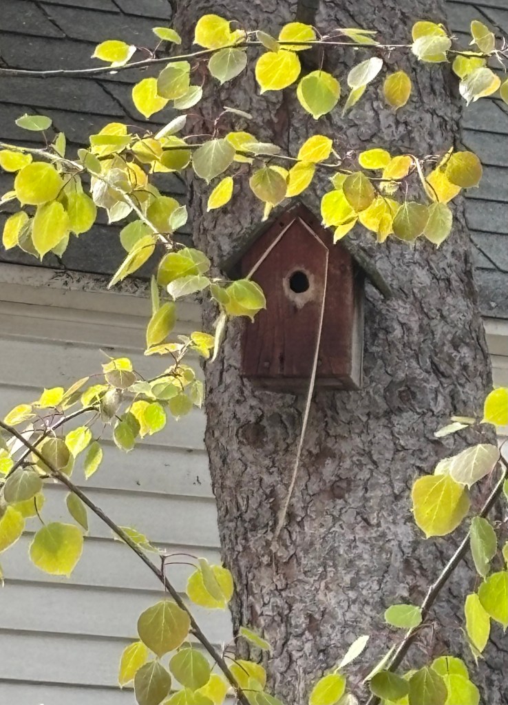 The birdhouse has been empty for years. We thought of it more as a backyard decoration than an actual residence for birds. We couldn’t believe it when we saw a chickadee squeeze through the hole and disappear. Soon long strands of grass hung over the doorway. The chickadee spouse stands guard. It forages and drops food into the house.