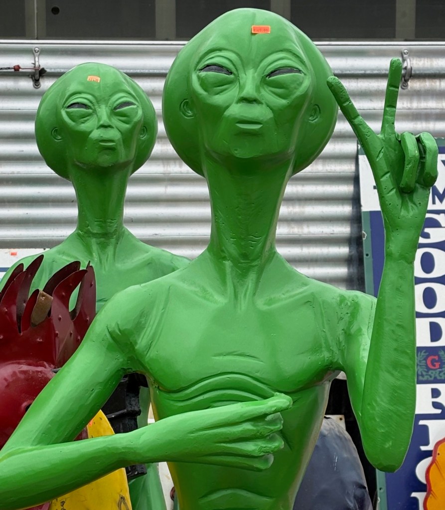 We saw the little green men at an antique fair. They come in peace. I wondered so asked the Oracle Google why aliens – peaceful or not – are always depicted as green. The AI master responded: