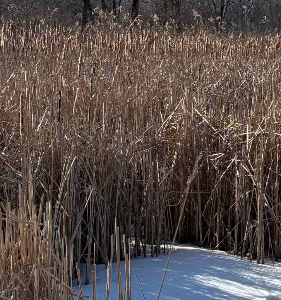 I have grown enamored of the winter reeds and grasses. On a section of a favorite trail there is an area of distressed drainage. In the summer it is a gathering place for turtles. In the winter the water freezes and the amber grasses sway on a field of blue ice and snow. It never fails to capture our attention. It never fails to bring us back to a quiet center, in touch with an enduring truth. I listen to the whisper-song of the grasses as Kerri photographs the play of colors. Standing in the mud and the cold we marvel at our good fortune.
