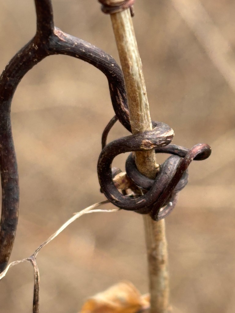 Watching a time-lapse of the vine you’d swear it was a conscious creature. Tendril arms search for supports, stretching. seeking and grasping, it knots itself around leaves and stems of competitors, twisting to strengthen its grip, competing to secure its place in the sun. It begs the question, how might we humans be in the world if we understood that plants were conscious, like us, awake and aware of their surroundings? Would we be more awake and aware of our surroundings? Or would we fear green consciousness and fill our mythos-minds with a Little Shop of Horrors? Feed Me!
