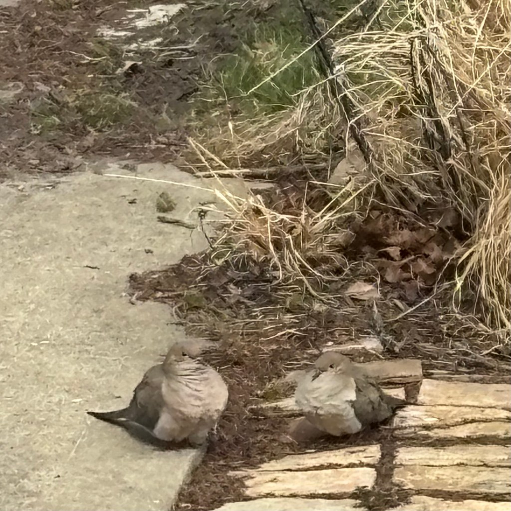 This year we have a mourning dove couple in residence. I’ve not yet discovered their nest but they are regulars, pecking in the yard. They are daily visitors at the bird-bath-drink-n-spa. They perch on the wires or the roof of the neighbors garage and sing their siren song, spinning a spell of serenity over us as we sit and absorb the sun. Dogga chases them. They squawk and complain but always return when he settles on the deck for a snooze.