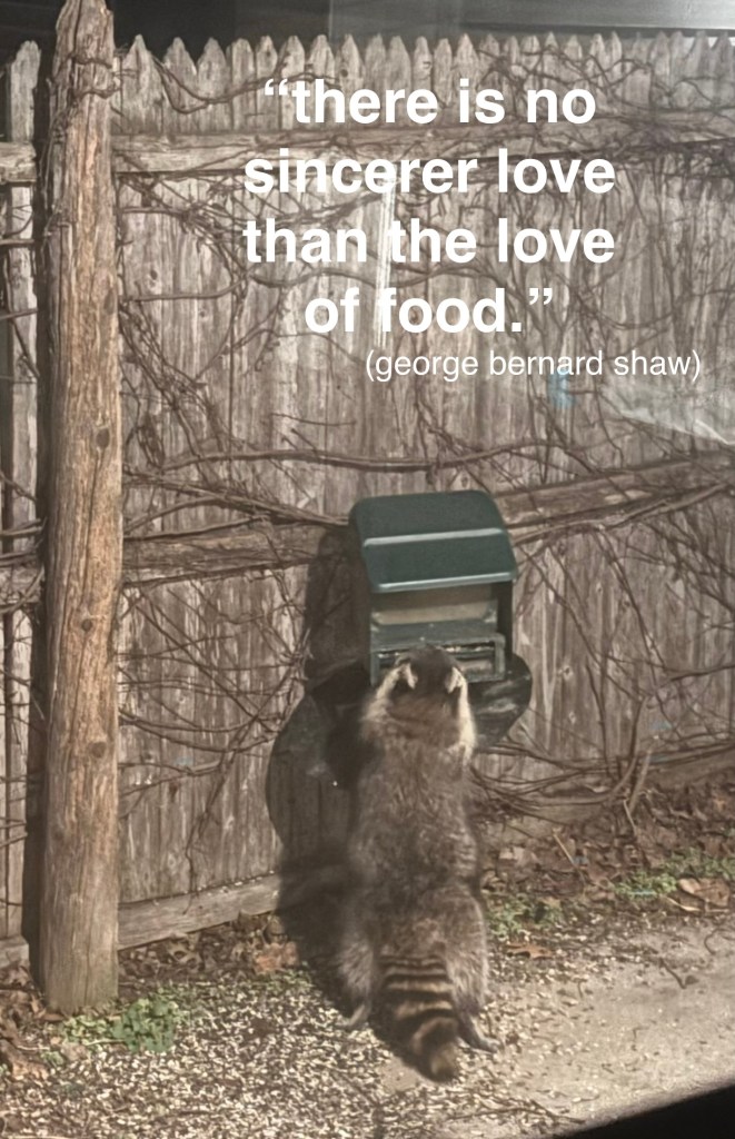 Late in the night we heard the clang of the useless squirrel guard on the bird feeder. It sounds like someone dropped a metal garbage can lid. We flipped on the back porch light and peered through the blinds. A raccoon was feasting on the bird seed. He expertly worked the mechanism to deliver new seed to the tray. He snacked like an uninvited guest at a wedding buffet. We chuckled at his delight, his nonchalance. The bright light did not deter his dining. His worship was more gluttonous than Joe’s pie-idolatry but no less satisfying. I suspect he knows that we will refill the feeder and do nothing to deter his future food frenzy.