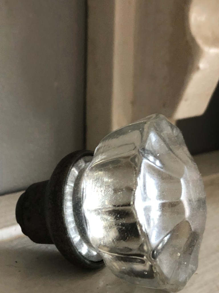 We keep a knob on the kitchen shelf. It is placed near the antique coffee pots that serve as tea containers. The knob is beautiful so it serves as a decoration. Another glass knob sits in the hole next to the kitchen faucet that once was a soap dispenser. The dispenser was problematic so it was retired but that left a hole. One morning I found a knob plugging the hole and knew Kerri was trying it on as a solution. It catches the morning light and occasionally casts a rainbow on the backsplash. Kitchen performance art; it’s a keeper.