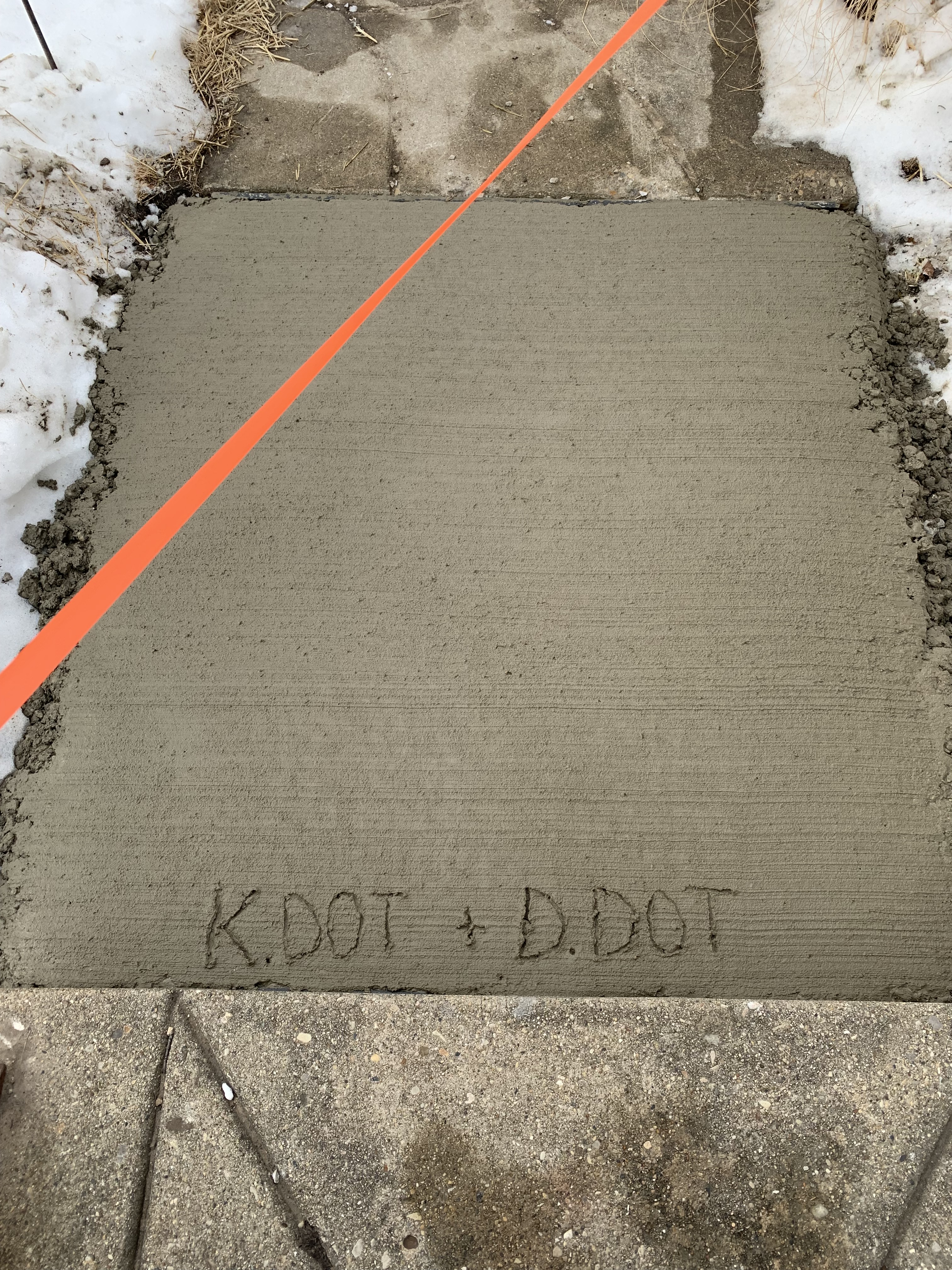 The crew that arrived this week to put in the temporary slab of sidewalk for the chunk we lost during the great-water-main-trenching-day, suggested that we sign our slab. It will come out in the spring when it’s warm enough to pour the real thing. We grabbed a screwdriver and happily scribbled our names in the wet cement.. As I stepped back to admire our scribble, I was struck by the names we scribed. K.Dot + D.Dot. Kerri and David, those two people who wrote to each other so many years ago, are transformed. Rebranded. It feels funny in my mouth to say, “Kerri.” I never do unless talking about her to someone who’s not familiar with the transformation.