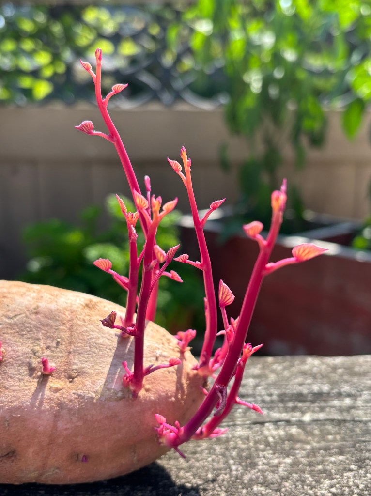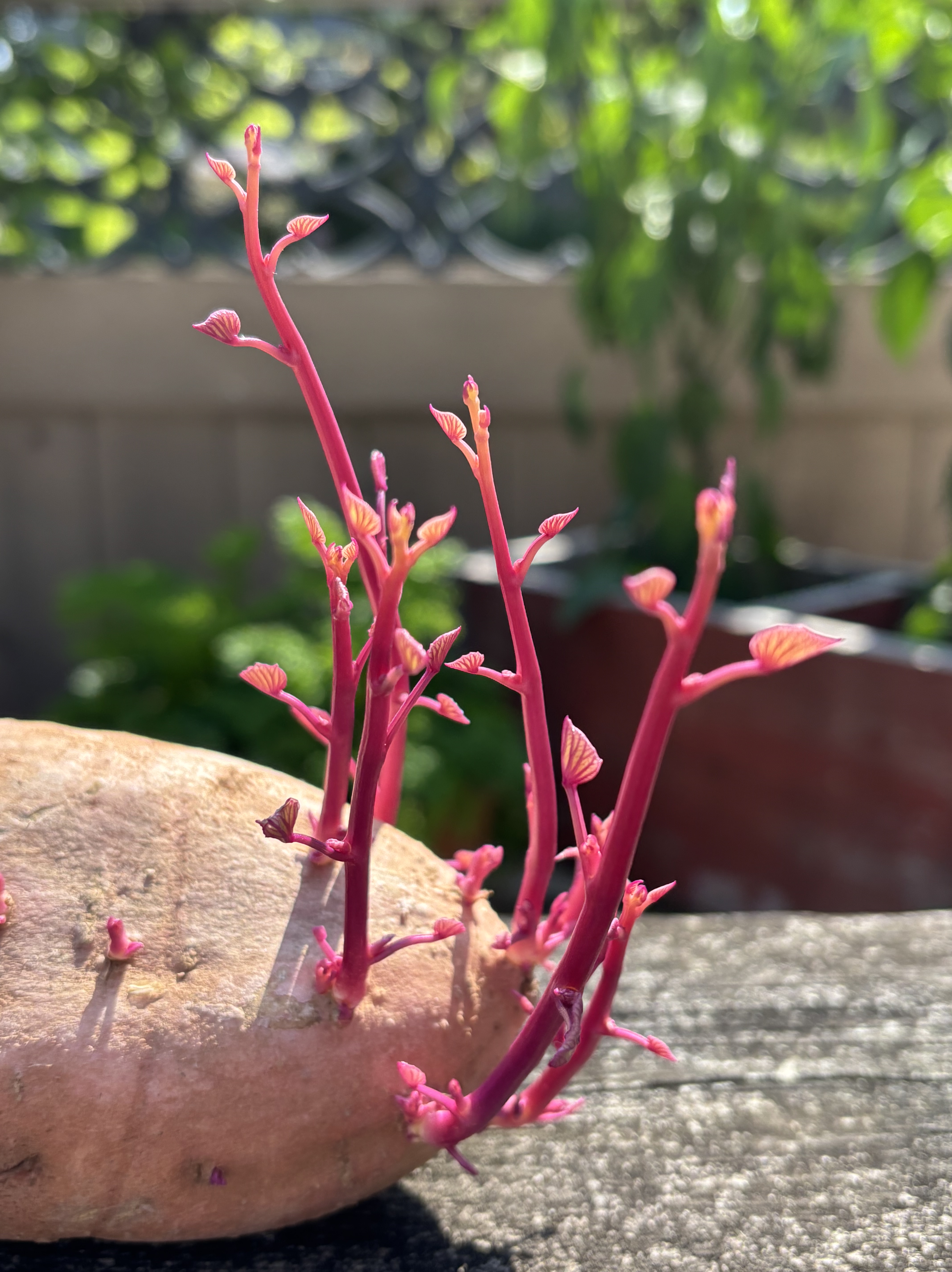 While there was a break in the rain we ran outside to check the rapid growth of the sweet potato. Last week we discovered a sweet potato in the stair-well potato basket that seemingly overnight had become an alien. Hot pink tentacles reached from the basket like so many periscopes. We pondered what to do and decided to experiment and planted it. If you are a farmer or otherwise schooled in the art of growing things, please feel free to roll your eyes. Since we are not farmers and total novices at growing things, the explosion of leaves from the once-hot-pink-tentacles seems to us like a miracle. I hope this awe never dissolves into the ordinary. I like running outside with the express expectation of being amazed.