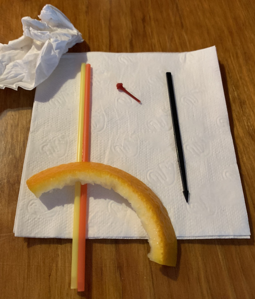 Have I confused you? It’s simple really. Limit your palette to two bar napkins, two sipping straws, and the fruit remnants from a brandy old-fashioned. Arrange a composition. Snap a photo for posterity. Ask yourself and others, “What does it mean?” And, when you find yourself concocting answers to the great amusement of your friends, you might recognize that the actual art-of-the-moment is the performance of the improvisational play entitled What Does It Mean?