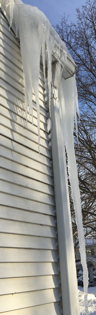 I have this odd sense that time is standing still. I know it is not true though I still go outside each day to check my one sure source of proof: the ever-growing icicles. Ice damming. Without time, the icicles would not grow.