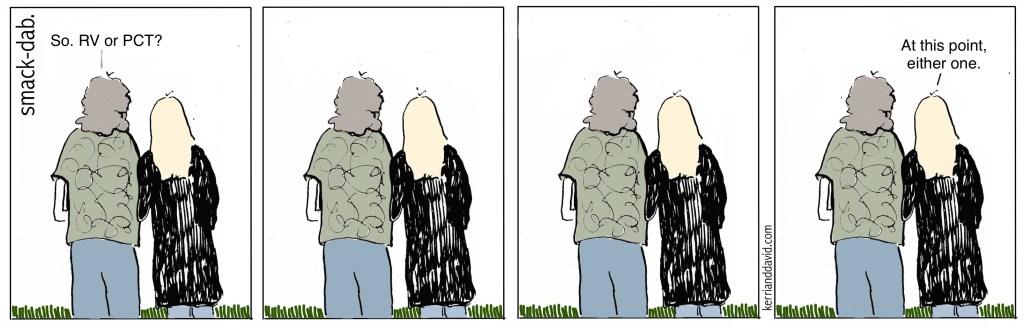 The lesson came around again, this time while indulging in one of our favorite quirks. Before sleep, we watch hiking videos on YouTube. A recent favorite is Jack Keogh’s, Walking on A Dream. Early in his PCT through-hike, he comments that, without exception, everyone is new to the experience and just trying to figure stuff out. “Everyone has their training wheels on.” Kerri whispered, “That’s true in all of life.” As she sat up to write the phrase, I heard Quinn chuckling. He had a great chuckle.