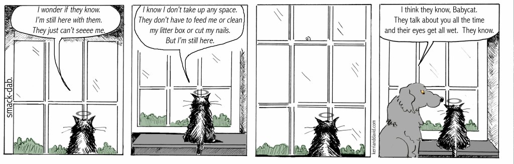 BabyCat has been gone for over a year and a half. In our old house, at night, when a floor board upstairs creaks or thumps, I still think, “There’s that BabyCat!”