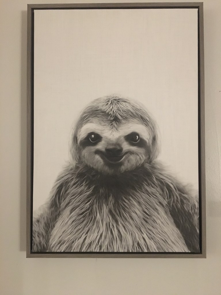 I stared at the print in our Airbnb. It made me smile. A happy sloth sitting for a portrait. My children’s book-story-imagination ran amok with the possibilities. This sloth might be pals with Pooh.