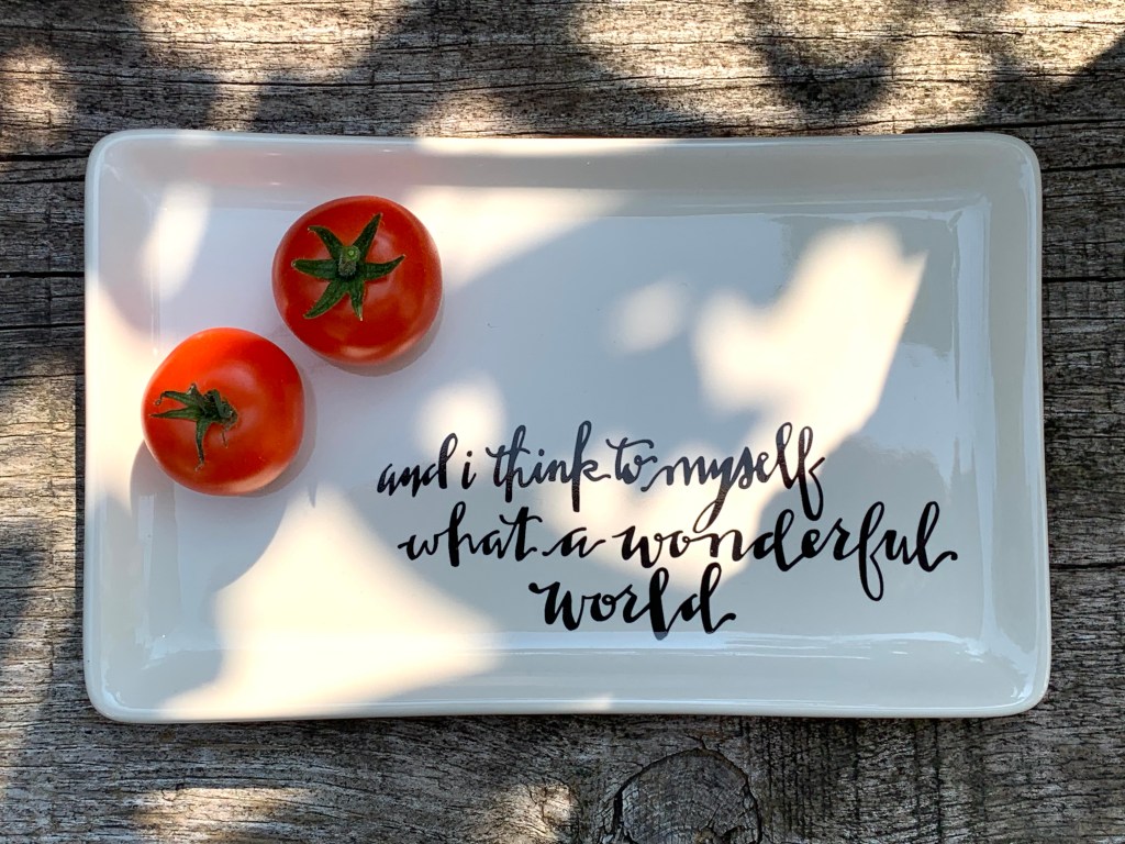 One of my favorite simple pleasures each day is watching Kerri go out in the early morning and tend to her tomatoes. The world is quiet. The coffee is brewing. Dogga makes sure the yard is clear of marauding squirrels so the path to tomatoes is safe. An extraordinary ordinary moment. A tender ritual. A wonderful world.