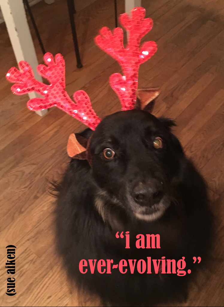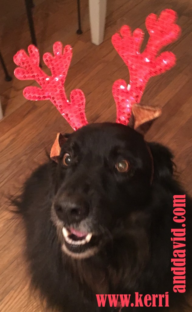 DogDog actually sat still long enough to don antlers and have his picture taken. This is progress. Our Aussie pup rarely sits still and is known for his committed resistance to headwear. He is, however, responsive to the promise of treats and the real story of his antler success is Kerri’s ability to juggle the antlers, the camera and the waving of a treat – all in one balletic gesture. I suspect we are not so different from DogDog: all evolution is probably snack driven.